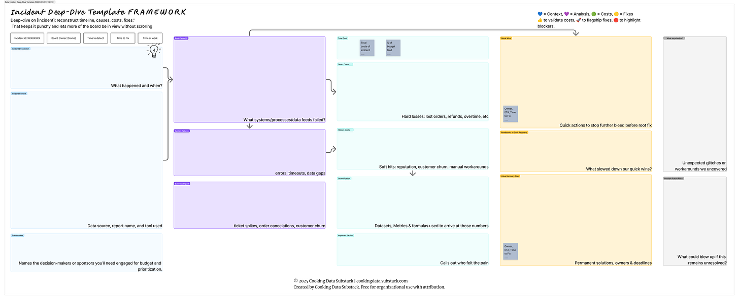 Imagine the sinking feeling when you realize a seemingly minor data glitch has been silently costing your business thousands in lost revenue every hour. That's the stark reality we faced after a seemingly routine incident on our platform. We chased technical fixes, unaware that a subtle data corruption was causing widespread cart abandonment and silently frustrating our customers. It wasn't until the alarming drop in key metrics hit our dashboards that the true financial bleed became terrifyingly clear. That painful lesson – the realization of how easily data incidents can bleed revenue and erode customer trust when we lack immediate financial visibility – is the direct reason I developed the Data Incident Deep‑Dive Template. This edition introduces a framework to bring that crucial financial clarity to the chaos...
